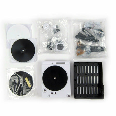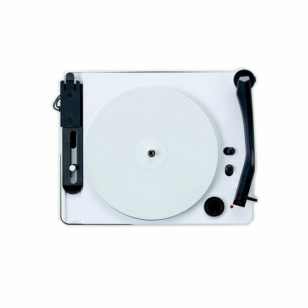 Consisting of a cutting arm as well as a playback tone arm, the machine is unique in its functionality. To cut a record, the user simply plays audio through the provided auxillary cable or USB and then lifts the cutting arm onto a blank disc. Once the record is cut, users can instantly listen back to their recording through the tone arm and inbuilt speaker.